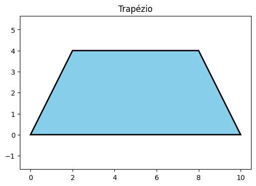plt.fill(x, y, color=”skyblue”, edgecolor=”black”, linewidth=2)Desenha o trapézio preenchido com cor azul clara e borda preta.